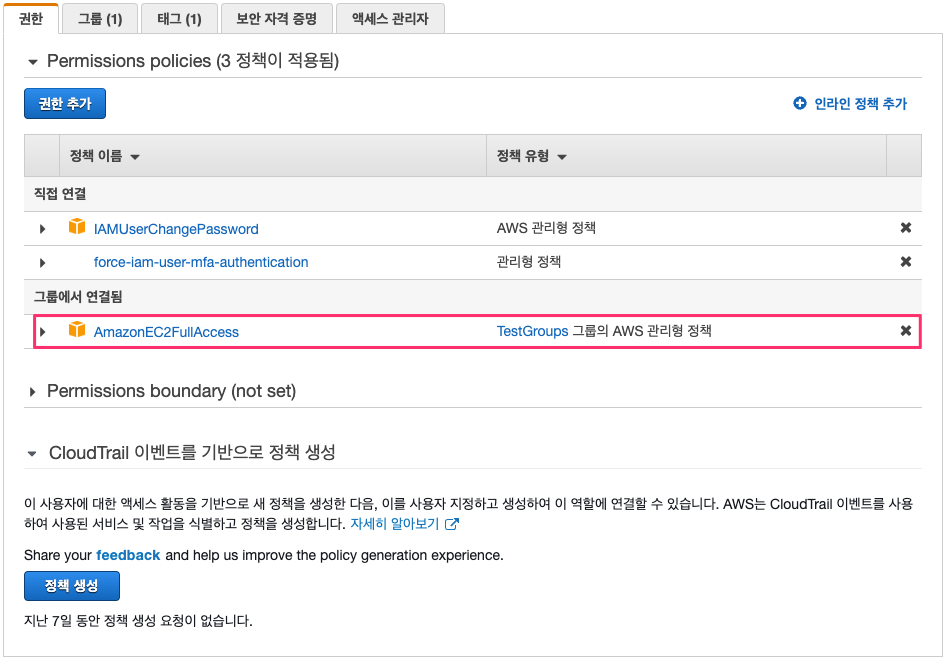 MFA 비활성화(AmazonEC2FullAccess 권한 부여했지만 API 오류가 발생)
