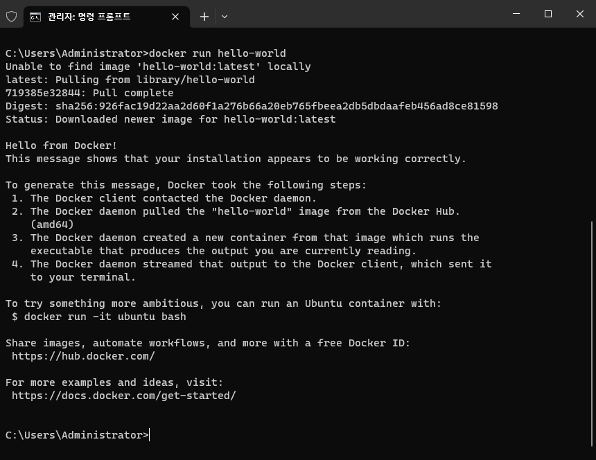 위와 같이 실행하면 컨테이너가 생성되고 "Hello from Docker!"와 같은 출력을 확인할 수 있습니다.