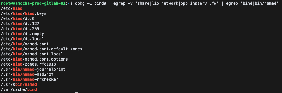 dpkg -L bind9 | egrep -v 'share|lib|network|ppp|insserv|ufw' | egrep 'bind|bin/named'