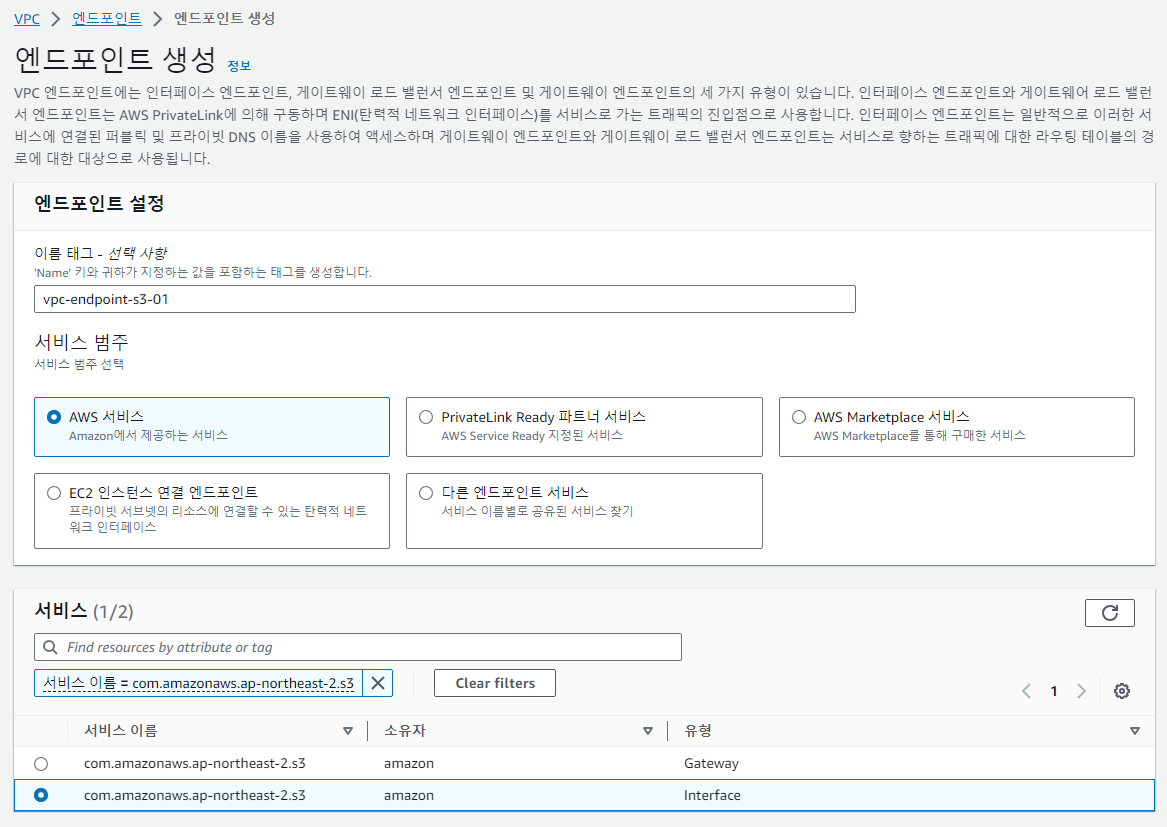 Amazon S3용 인터페이스 엔드포인트를 구성하려면 Amazon Virtual Private Cloud (VPC) 내에서 해당 엔드포인트를 생성하고 구성해야 합니다.