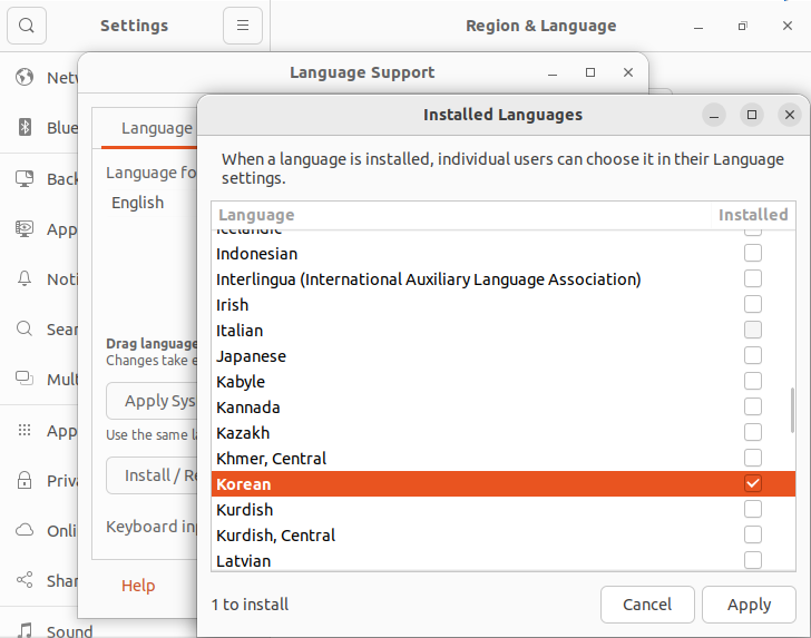 - 시스템 설정에서 "Region & Language"를 열어 추가 언어(한국어)를 설치하고 활성화합니다.