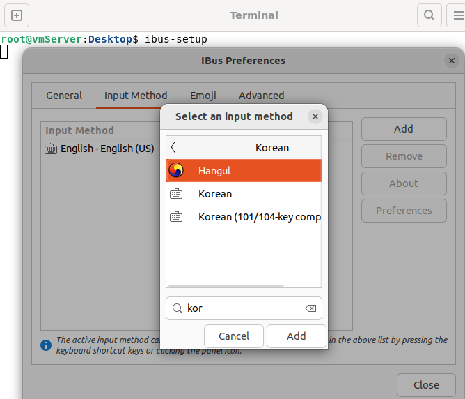 - 우분투에서는 기본적으로 IBus를 사용하여 다국어 입력을 관리합니다.