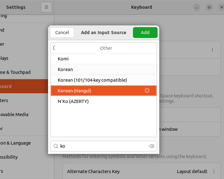 - "Add"를 클릭하고 "Korean(Hangul)"을 선택합니다.