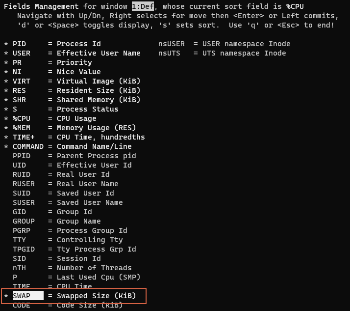 Fields Management for window 1:Def, whose current sort field is %CPU