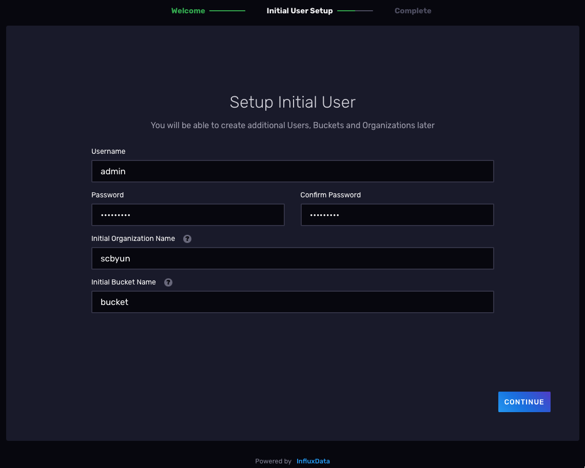 $ influx setup --username tadmin --password 'admin12#$' --org scbyun.com --bucket telegraf --retention 1w --force