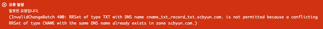(InvalidChangeBatch 400: RRSet of type TXT with DNS name cname_txt_record_txt.scbyun.com. is not permitted because a conflicting RRSet of type CNAME with the same DNS name already exists in zone scbyun.com.)