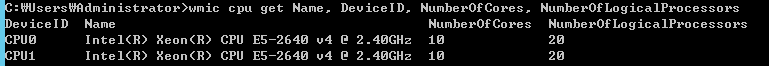 > wmic cpu get Name, DeviceID, NumberOfCores, NumberOfLogicalProcessors