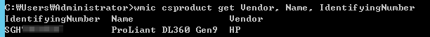 > wmic csproduct get Vendor, Name, IdentifyingNumber