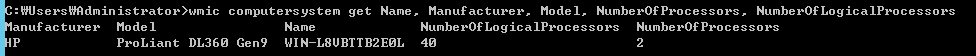 > wmic computersystem get Name, Manufacturer, Model, NumberOfProcessors, NumberOfLogicalProcessors