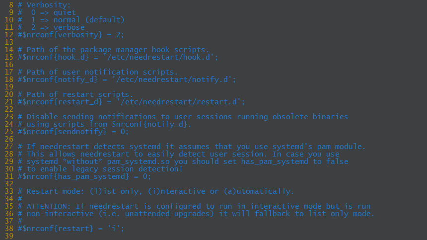 needrestart는 /etc/needrestart/needrestart.conf 파일에서 설정을 관리합니다. 이 파일을 수정해 재시작 여부를 묻는 메시지를 비활성화할 수 있습니다.