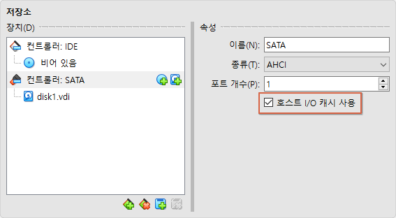 - VirtualBox에서 I/O 캐싱을 활성화하여 디스크 성능을 개선합니다.
