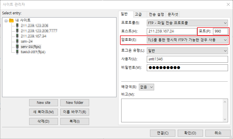 - 서버 유형: "FTPS - File Transfer Protocol (SSL)"을 선택합니다.