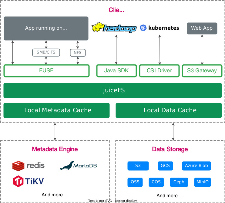 JuiceFS는 클라우드 네이티브 분산 파일 시스템으로 객체 스토리지를 기본으로 사용하고 메타데이터를 Redis, MySQL, PostgreSQL과 같은 데이터베이스에 저장합니다.