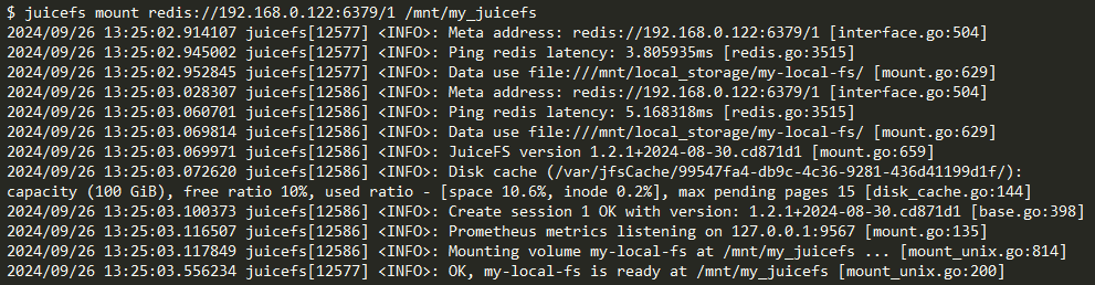juicefs mount redis://192.168.0.122:6379/1 /mnt/my_juicefs