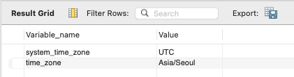 - @@global.time_zone : 이 변수는 MySQL(MariaDB) 서버의 글로벌 타임존 설정을 나타냅니다. 서버 전체에서 사용됩니다.