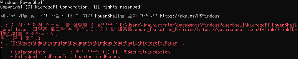 PowerShell에서 스크립트 실행 정책이 제한되어 있는 경우 발생하는 오류
