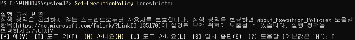 3. 현재 실행 정책을 확인한 후, 변경하려는 실행 정책에 따라 다음 명령어 중 하나를 실행합니다.