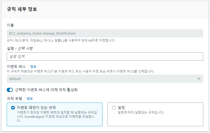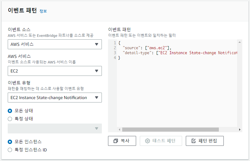 - 이벤트 유형 : EC2 Instance State-change Notification