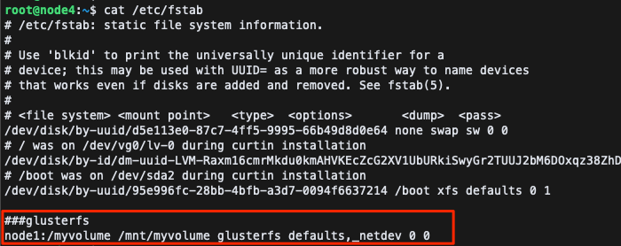 node1:/myvolume /mnt/myvolume glusterfs defaults,_netdev 0 0