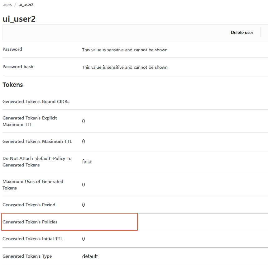 Vault UI에서 ui_user2 계정을 생성할 때 정책을 직접 추가할 수 없는 제한이 있습니다.