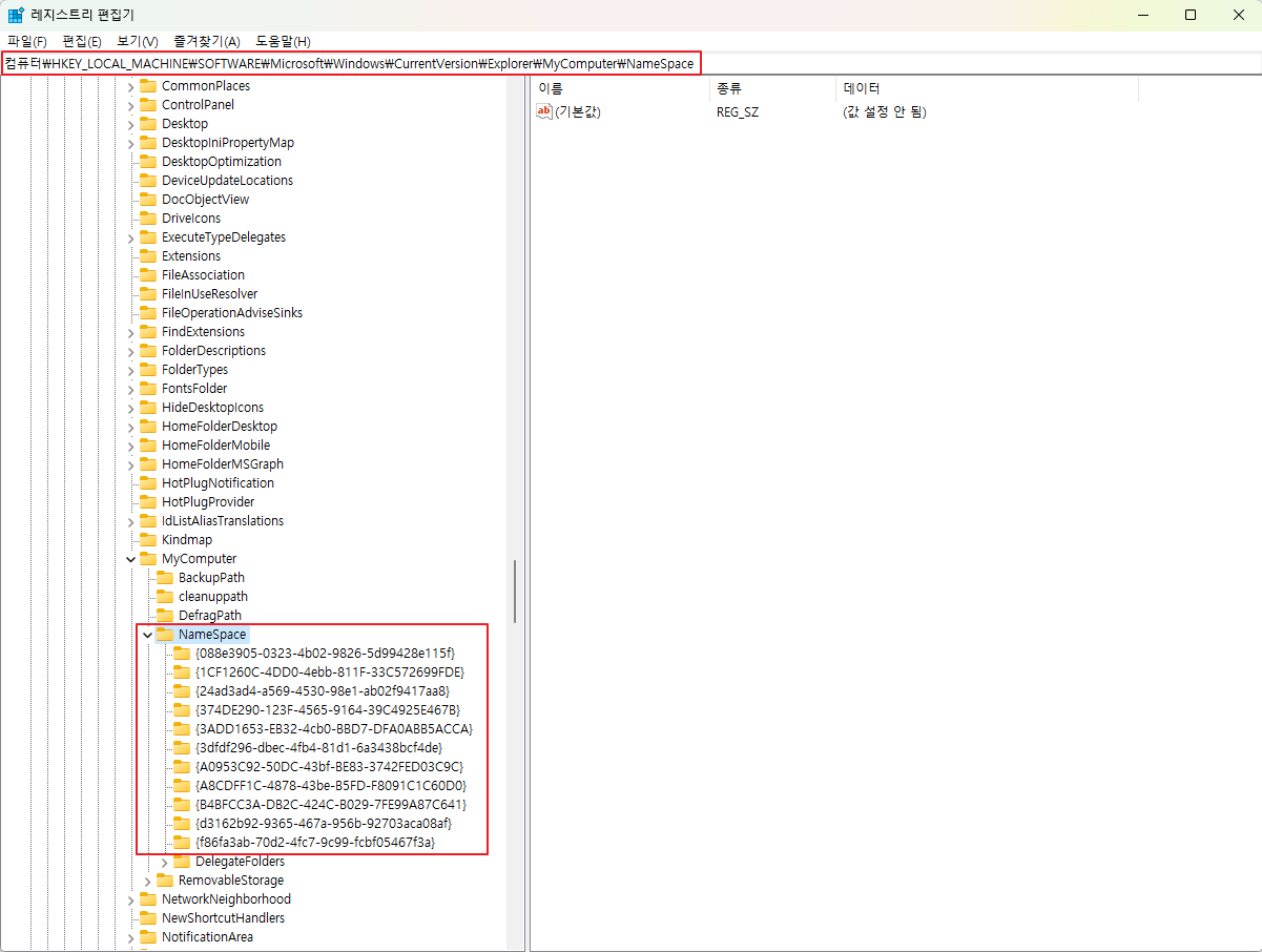 컴퓨터\HKEY_LOCAL_MACHINE\SOFTWARE\WOW6432Node\Microsoft\Windows\CurrentVersion\Explorer\MyComputer\NameSpace