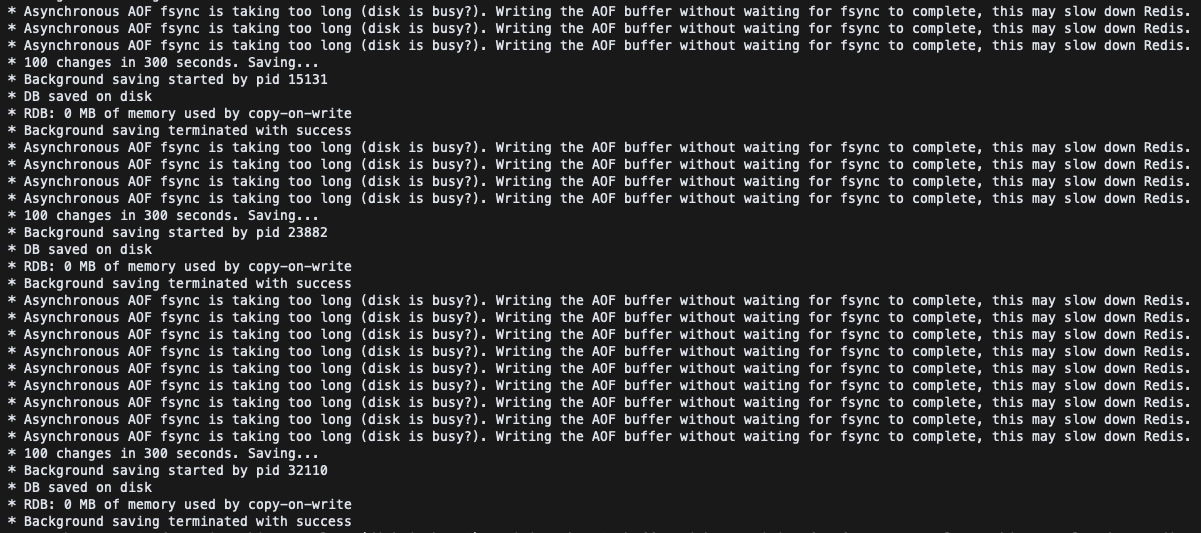 Asynchronous AOF fsync is taking too long (disk is busy?). Writing the AOF buffer without waiting for fsync to complete, this may slow down Redis.