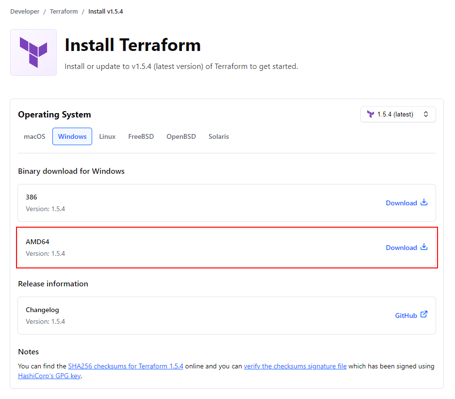 테라폼을 공식 웹사이트(https://www.terraform.io/)에서 다운로드합니다. 다운로드 페이지에서는 여러 버전의 테라폼이 제공됩니다. 최신 버전을 선택하거나 원하는 버전을 선택하여 다운로드하세요. 다운로드 후에 압축을 해제하고 테라폼 실행 파일을 원하는 위치에 복사합니다.