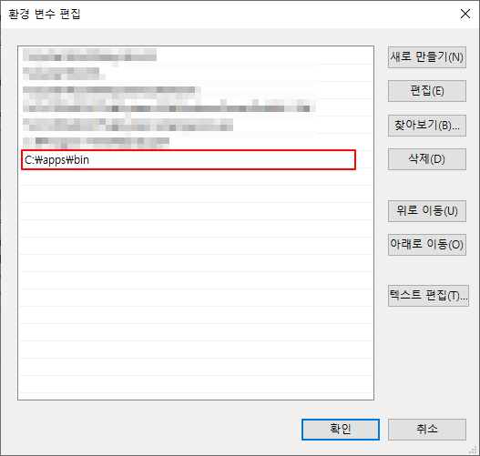 - "새로 만들기"를 클릭하여 테라폼 실행 파일 경로를 추가합니다. (예: C:\apps\bin)