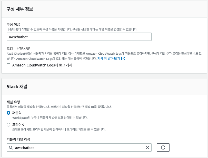 채널 생성 > awschatbot