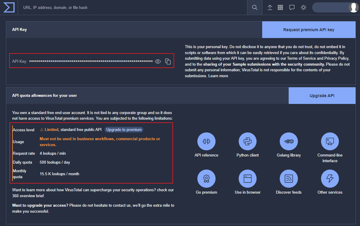 1. Virustotal 사이트에 가입하고 API 키를 발급받습니다. 발급받은 API 키는 Virustotal 계정 페이지에서 확인할 수 있습니다.