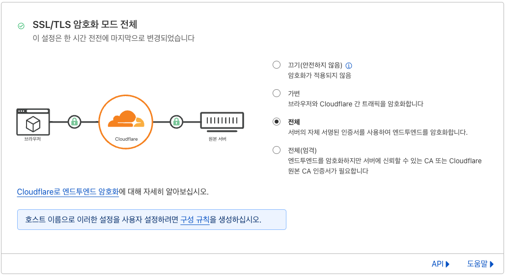 전체(Full): 암호화 모드를 전체로 설정하면 Cloudflare는 방문자와 Cloudflare 간의 HTTPS 연결을 허용하고 방문자가 요청한 체계를 사용하여 오리진에 연결합니다. 방문자가 http를 사용하는 경우 Cloudflare는 일반 텍스트 HTTP를 사용하여 오리진에 연결하고 그 반대의 경우도 마찬가지입니다.