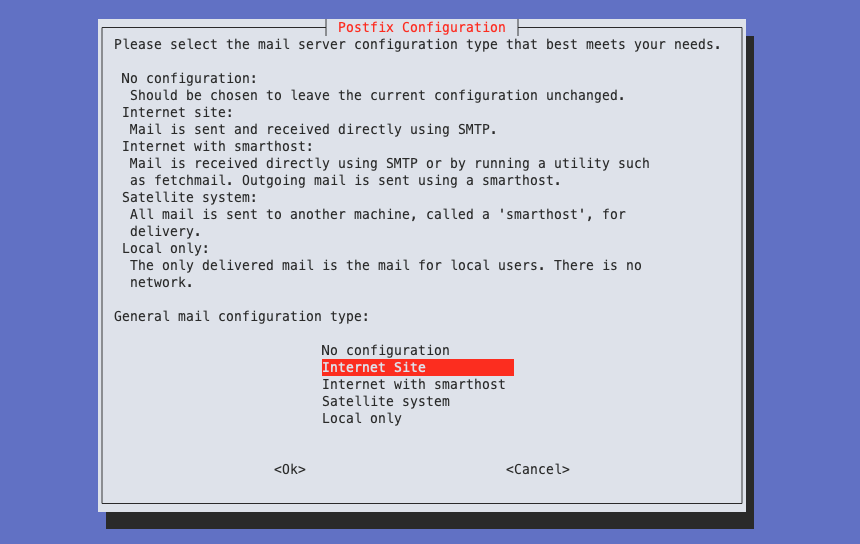 - "Internet Site" : Postfix가 일반적인 이메일 서버처럼 동작하도록 설정.