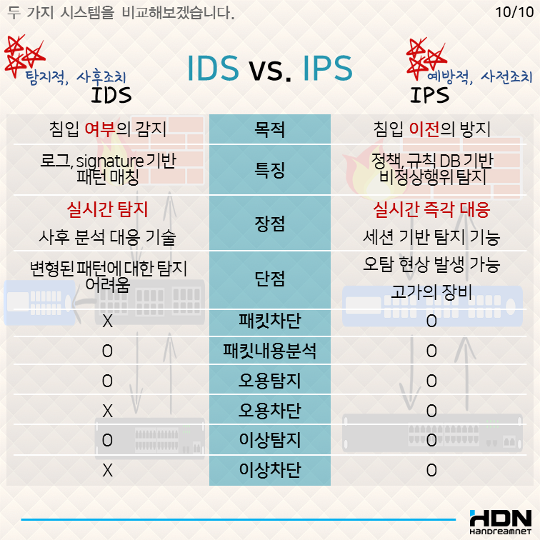 - 대응 조치 : IDS의 경우 알림을 통해 관리자에게 알림을 제공하고 IPS의 경우 실시간으로 공격을 차단하거나 트래픽을 수정하여 공격을 방지합니다.