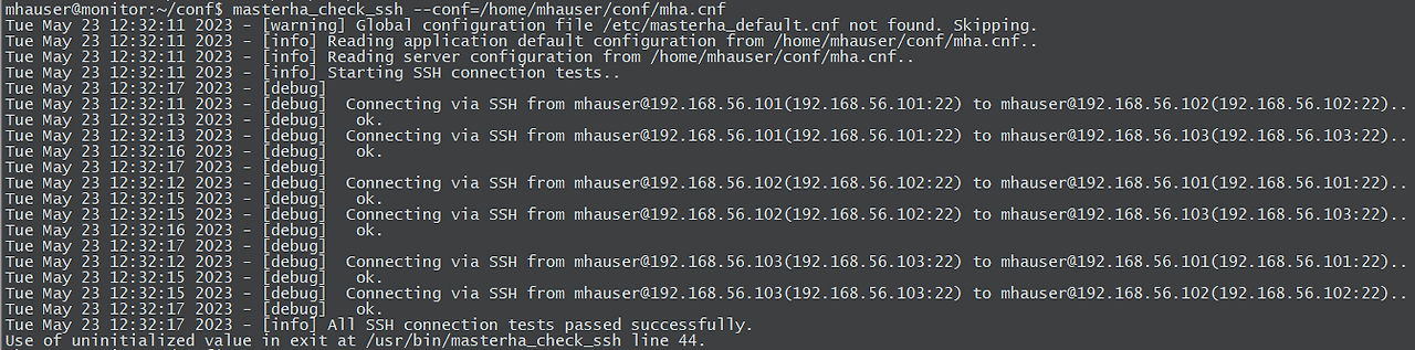 masterha_check_ssh --conf=/home/mhauser/mha/conf/app1.cnf