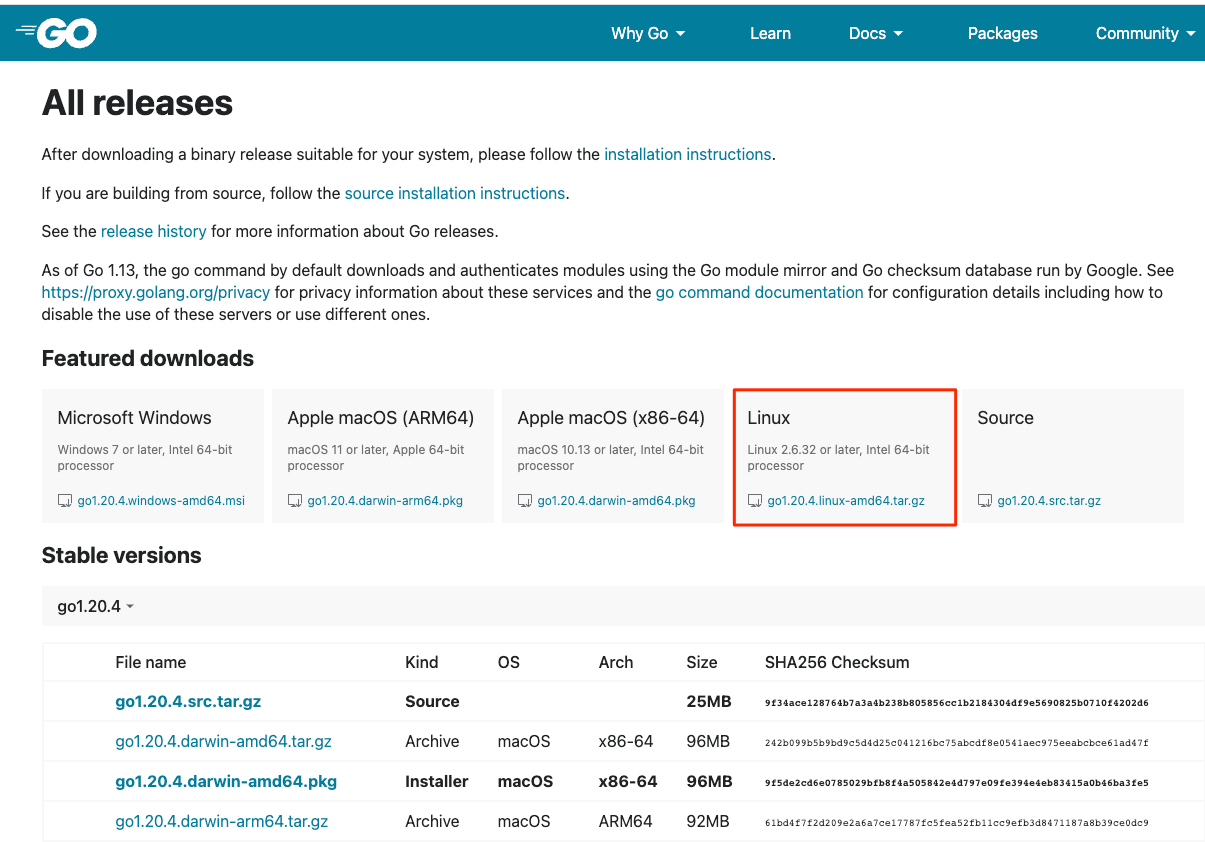 선택한 버전의 다운로드 링크를 클릭하여 Go 설치 파일을 다운로드합니다. 일반적으로 .tar.gz 형식의 압축 파일입니다.