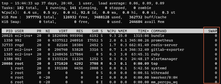 1337 ec2-ins+ 20 0 296740 54412 3800 S 4.0 1.4 346:26.32 gitlab-exporter