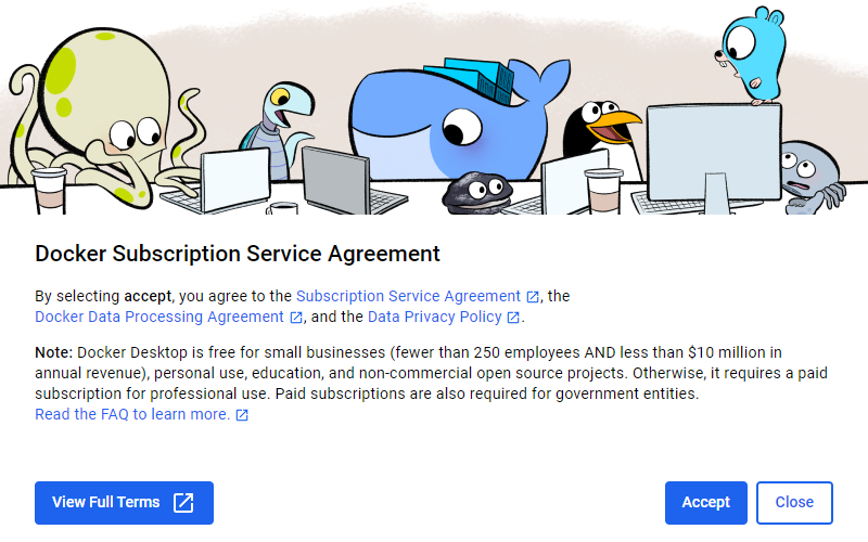 Docker Desktop이 처음 실행되면 Service agreement에 동의합니다.