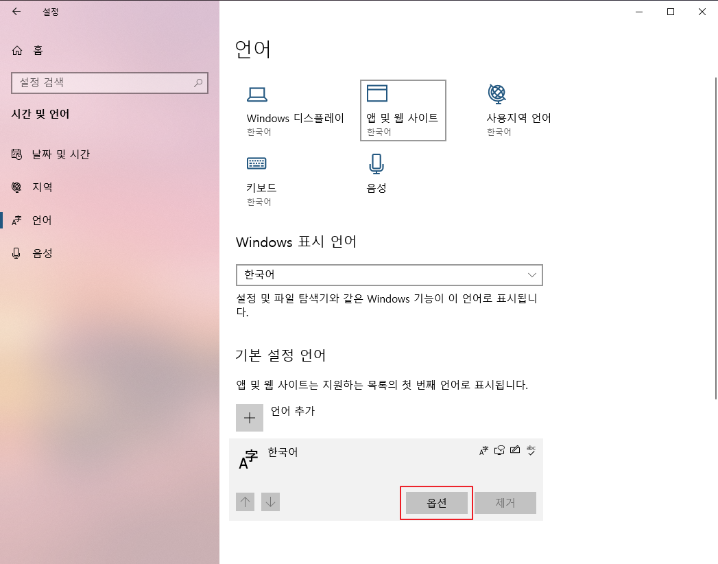 설정 > 시간 및 언어 > 언어 > 한국어 > 옵션