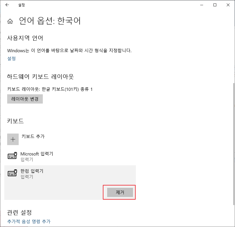 언어 옵션: 한국어 > 한컴 입력기 > 삭제
