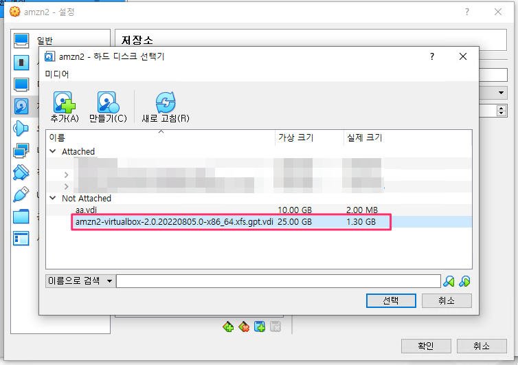 Amazon Linux 2 LTS 2.0 VirtualBox image(amzn2-virtualbox-2.0.20220805.0-x86_64.xfs.gpt.vdi) 미디어 추가