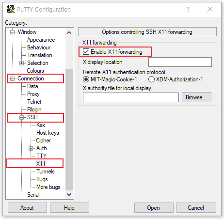 - Connection -> SSH -> X11 -> X11 forwarding => Enable X11 forwarding