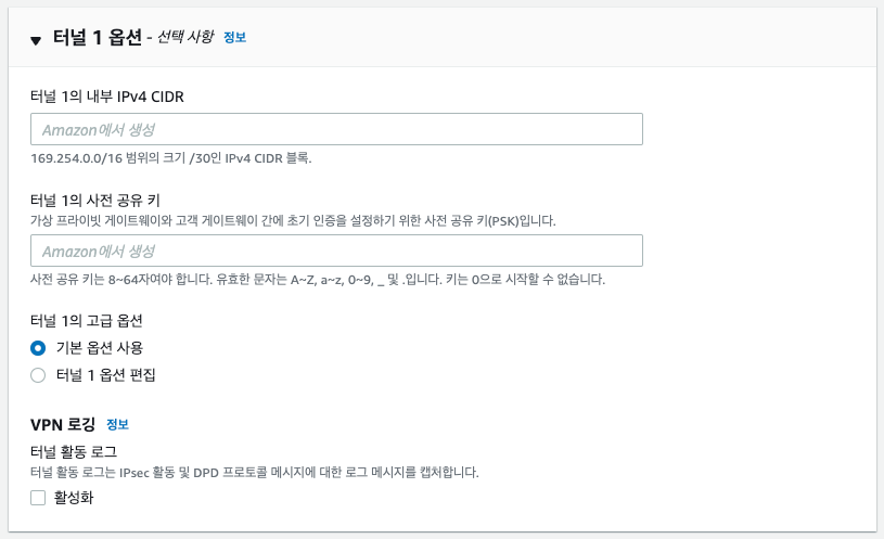 터널 옵션은 기본값 사용 (Pre-shared Key 자동 생성)