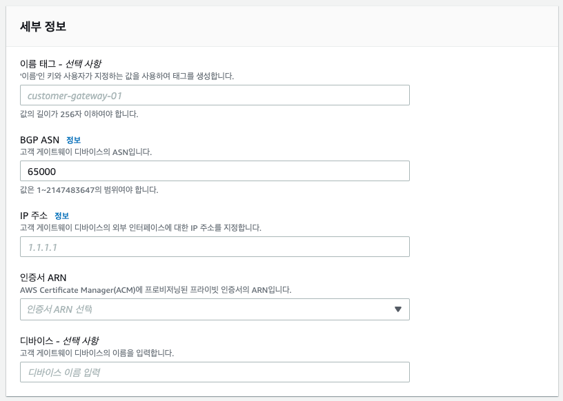 - 고객 게이트웨이 ID : cgw-0a1b2c3d4e5f6g7h8