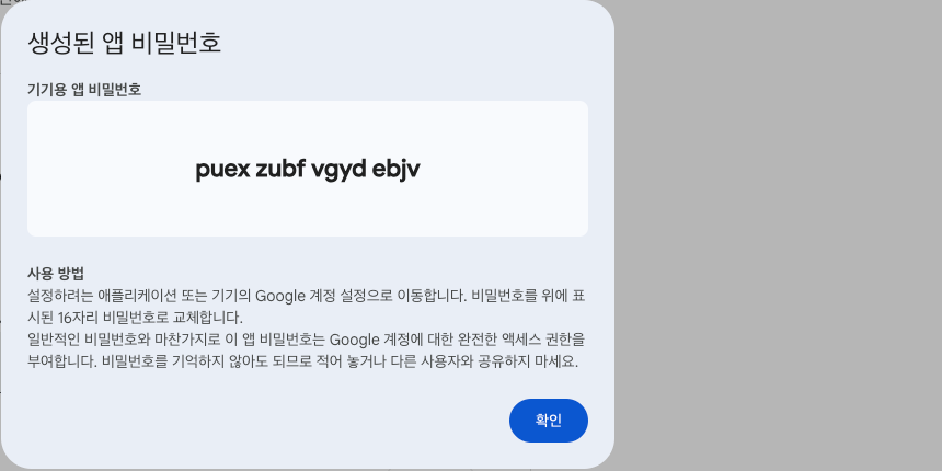 "만들기" 버튼을 클릭하면 16자리 비밀번호가 표시됩니다.
