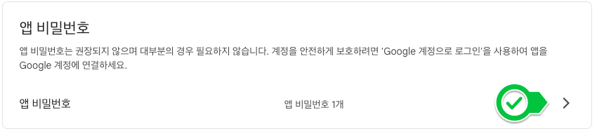 - 2단계 인증 비활성화 상태에서는 앱 비밀번호를 생성할 수 없습니다.