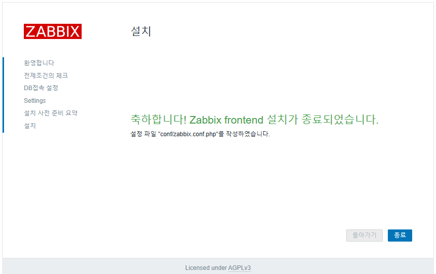 웹 브라우저에서 Zabbix 웹 설치 마법사를 완료합니다.