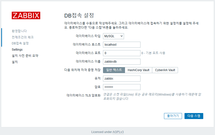 웹 브라우저에서 Zabbix 웹 설치 마법사를 완료합니다.