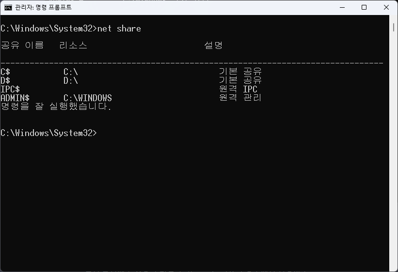 위의 작업을 완료하면 C$, D$, IPC$, ADMIN$와 같은 관리자 공유 폴더가 비활성화됩니다. 이제 해당 공유 폴더에 대한 일반적인 접근이 제한됩니다. 하지만, 이러한 변경은 시스템 관리나 원격 접속 등과 같이 관리적인 작업에도 영향을 미칠 수 있으므로, 필요한 경우에만 변경하도록 합니다. 올바른 보안 설정을 위해서는 해당 컴퓨터의 용도와 요구 사항을 고려하여 설정해야 합니다.