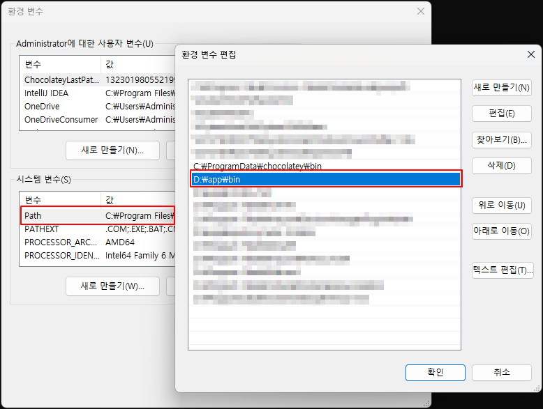 시스템 변수 > Path 편집 > "D:\app\bin" 등록