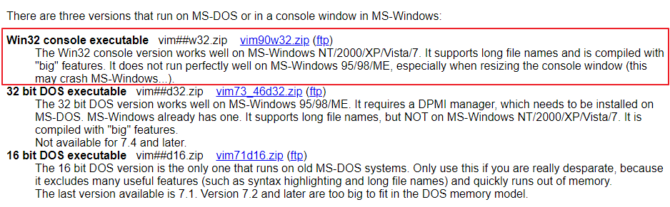다운로드 페이지에서 Windows용 Vim 설치 파일을 찾아 다운로드합니다.